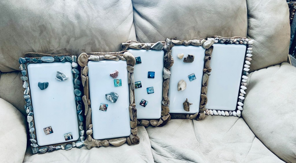 The process starts with a simple magnetic surface and builds from there. Some frames are more driftwood-heavy, others are lined with smooth stones or shells, and a few have pops of sea glass. There’s no template and nothing mass-produced here; the pieces really decide the layout themselves (and coming from someone who helped make one on a snowy afternoon, they’re SO fun!)